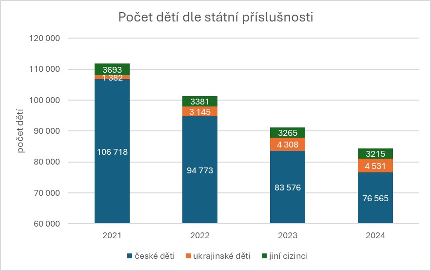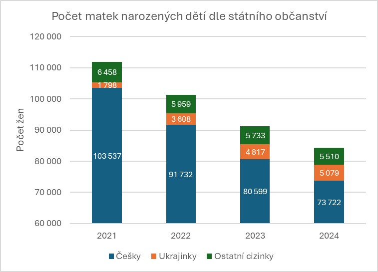 Obdržená data o počtech narozených dětí Češkám, Ukrajinkám a ostatním cizinkám jsou uvedena v grafu. Je evidentní, že podíl cizinek mezi rodičkami rok od roku stoupá. Zatímco v roce 2021 bylo cizí státní příslušnosti 7,4 % rodiček, v roce 2024 to bylo už 12,6 %, přičemž přibližně polovina cizinek pocházela z Ukrajiny.